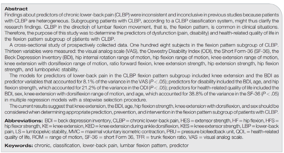 Title : Predictors of dysfunction and health-related quality of life in the flexion pattern subgroup of patients with chronic lower back pain: The STROBE study.