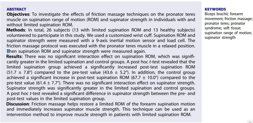 Title : Immediate improvements of supination range of motion and strength following pronator teres muscle friction massage: a clinical trial comparing people with and without supination limited motion