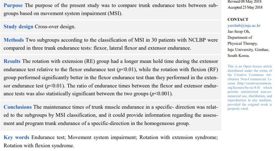 Comparison of Trunk Muscle Endurance between Lumbar Rotation with Flexion Syndrome and Rotation with Extension Syndrome