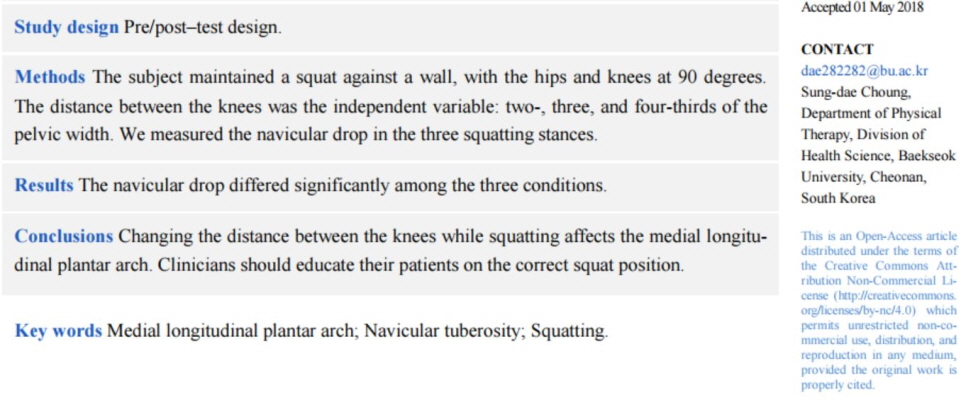 Change in the Height of the Medial Longitudinal Plantar Arch according to the Distance between the Knees While Performing Squats