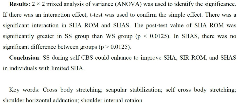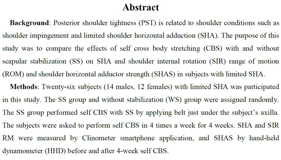 Title : Effects of 4-week self cross body stretching with scapular stabilization on shoulder motions and horizontal adductor strength in subjects with limited shoulder horizontal adduction