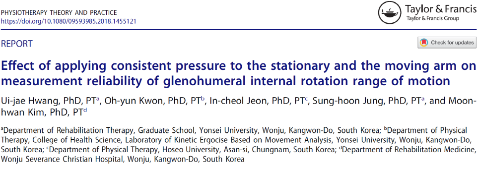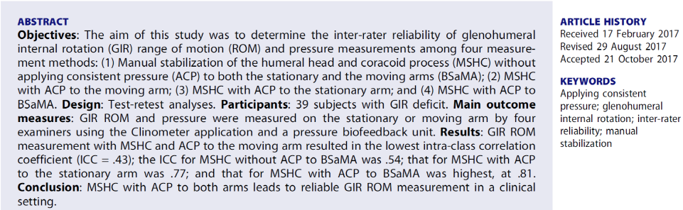 Title : Effect of applying consistent pressure to the stationary and the moving arm on measurement reliability of glenohumeral internal rotation range of motion