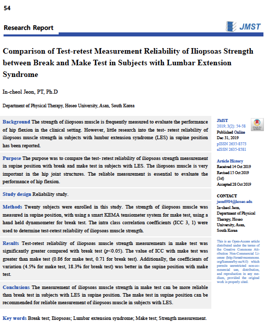 Comparison of Test-retest Measurement Reliability of Iliopsoas Strength between Break and Make Test in Subjects with Lumbar Extension Syndrome