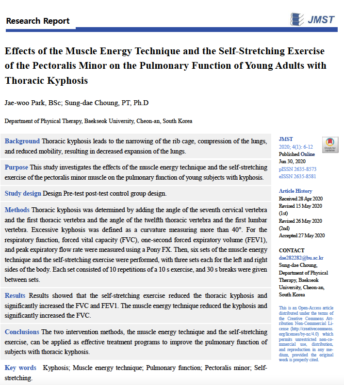 Effects of the Muscle Energy Technique and the Self-Stretching Exercise of the Pectoralis Minor on the Pulmonary Function of Young Adults with Thoracic Kyphosis