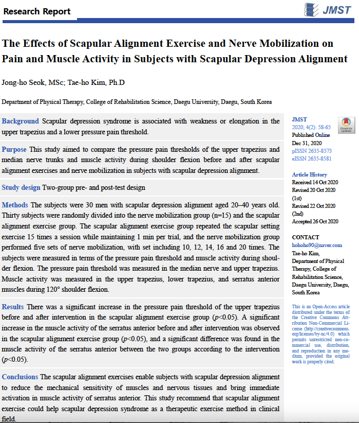 The Effects of Scapular Alignment Exercise and Nerve Mobilization on Pain and Muscle Activity in Subjects with Scapular Depression Alignment