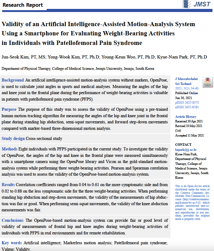 Validity of an Artificial Intelligence-Assisted Motion-Analysis System Using a Smartphone for Evaluating Weight-Bearing Activities in Individuals with Patellofemoral Pain Syndrome