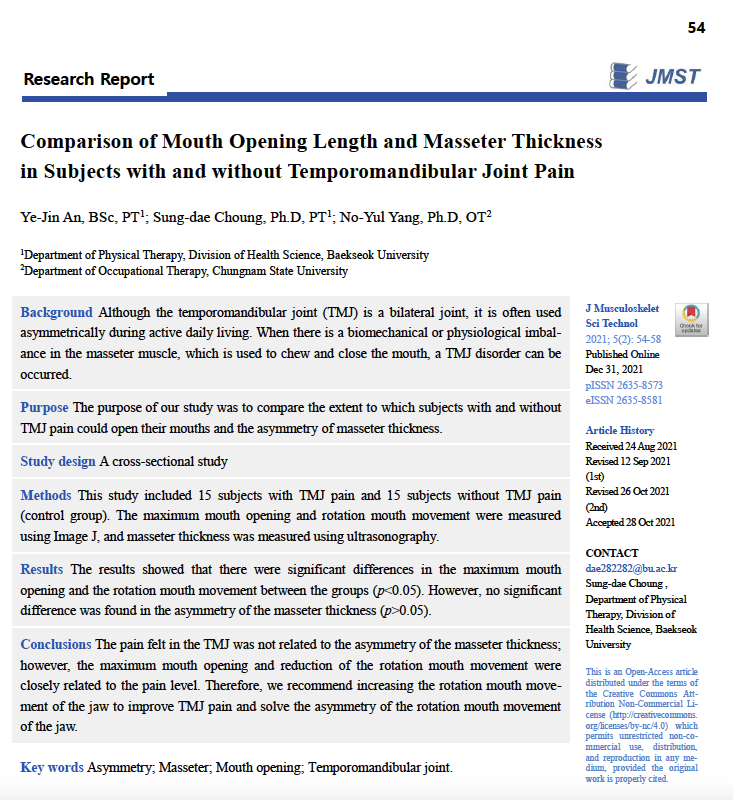 Comparison of Mouth Opening Length and Masseter Thickness in Subjects with and without Temporomandibular Joint Pain