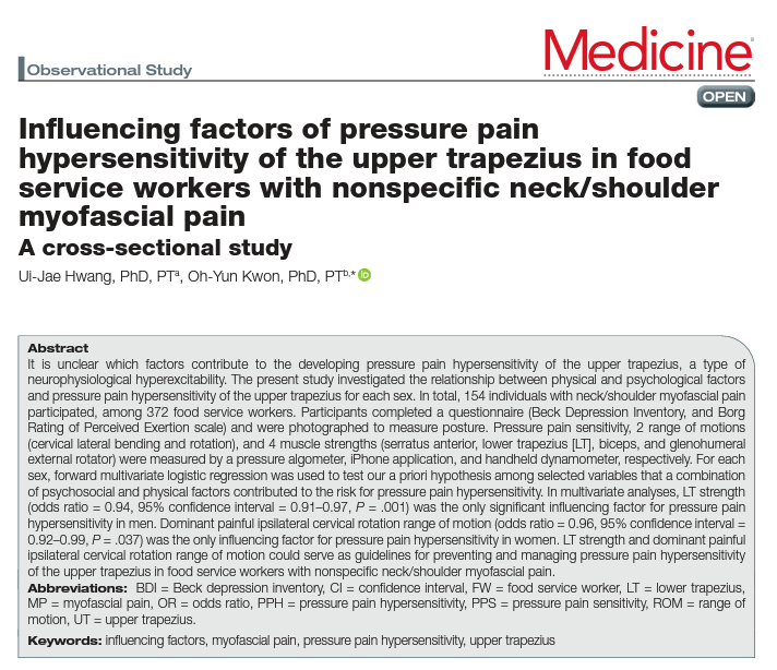 Title: Influencing factors of pressure pain hypersensitivity of the upper trapezius in food service workers with nonspecific neck/shoulder myofascial pain: A cross-sectional study.