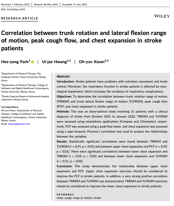 Title: Correlation between trunk rotation and lateral flexion range of motion, peak cough flow, and chest expansion in stroke patients