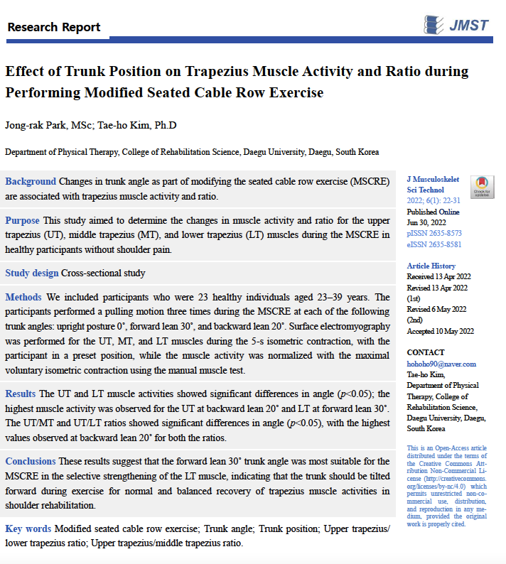 Effect of Trunk Position on Trapezius Muscle Activity and Ratio during Performing Modified Seated Cable Row Exercise