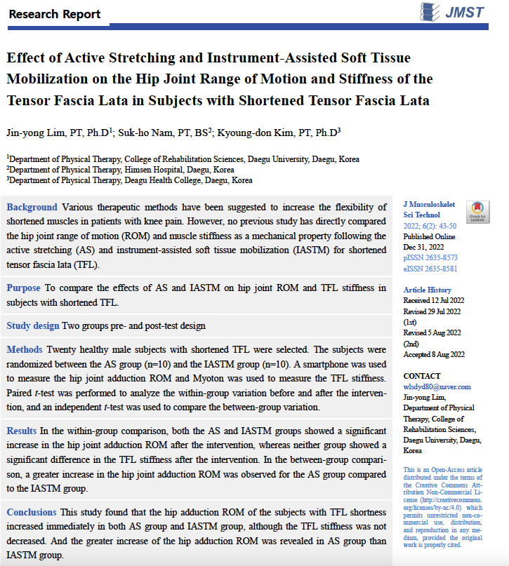 Effect of Active Stretching and Instrument-Assisted Soft Tissue Mobilization on the Hip Joint Range of Motion and Stiffness of the Tensor Fascia Lata in Subjects with Shortened Tensor Fascia Lata